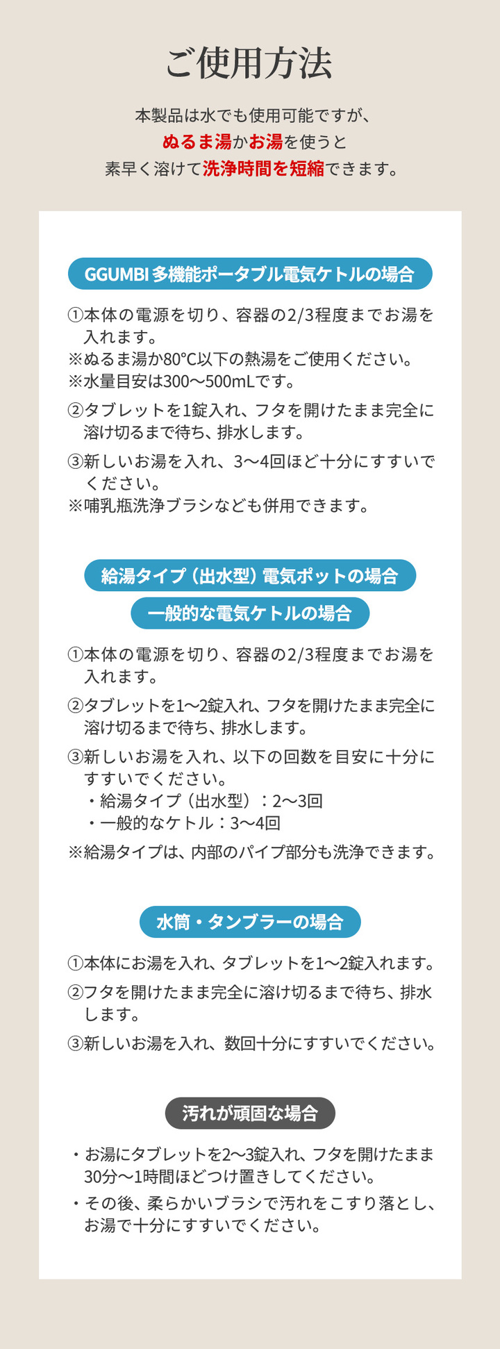 仕様 ・GGUMBI 多機能ポータブル電気ケトルはもちろん、一般的な電気ケトルやポット、水筒、タンブラー、食器類の洗浄にも使えます。