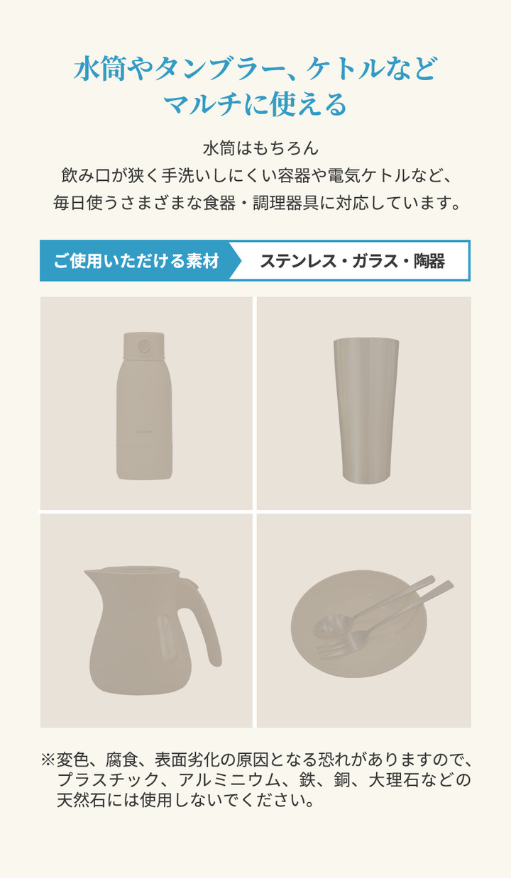 用途 ステンレス製品(水筒・ケトル等)および陶器製・ガラス製食器の洗浄
