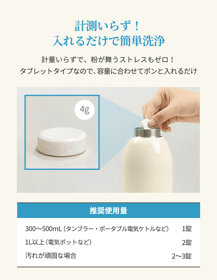 ・計測いらず。タブレット型で、容量に合わせて水にポンと入れるだけで簡単に洗浄できます。