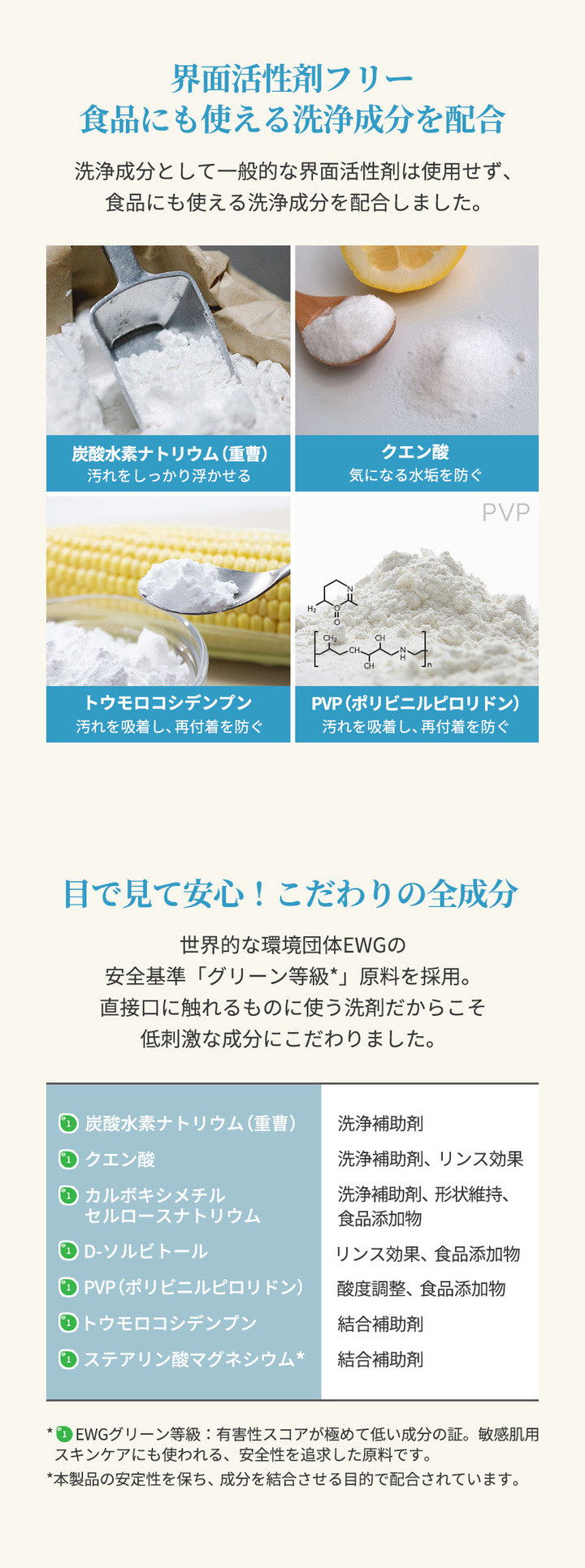 ・界面活性剤フリー。食品にも使える洗浄成分を配合しました。
