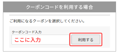 メールマガジンやSNSなどで配布されたクーポンコードを利用する場合は、ご注文手続き画面にてクーポンコードを入力し「利用する」ボタンをクリックしてください。